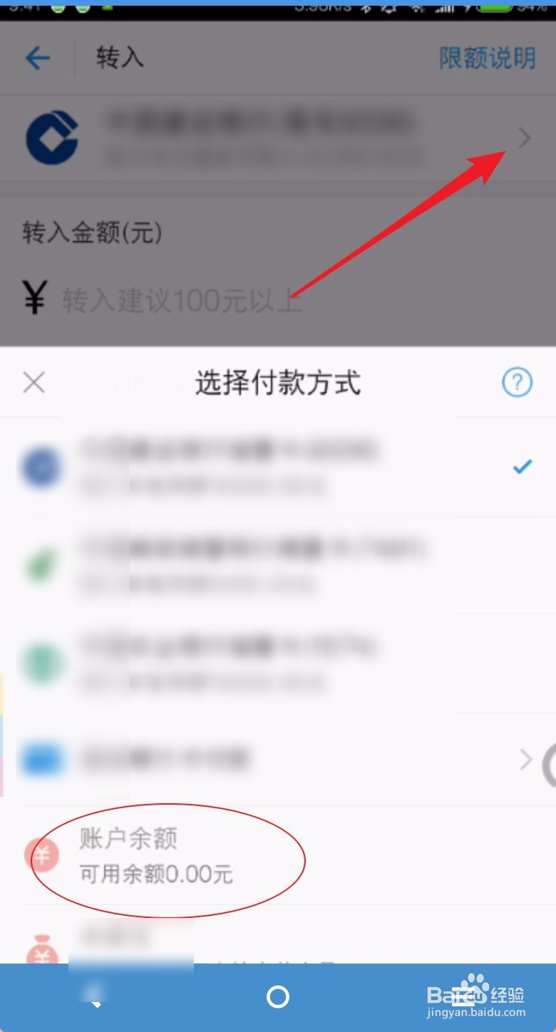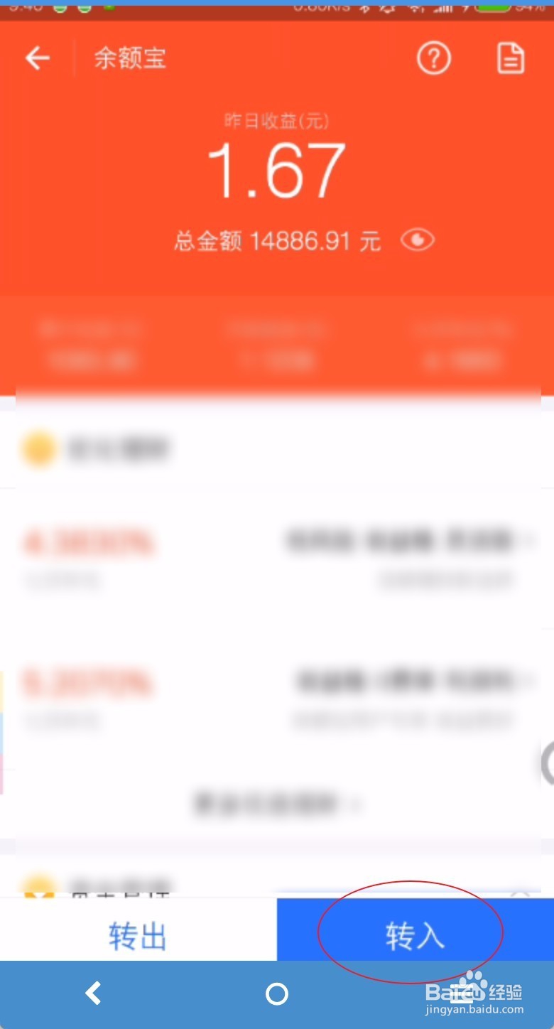 4、点击图一红色人民币图标,然后选择转入,在图三银行卡这里点击一下选择余额,把上面刚刚存入的转到这里。